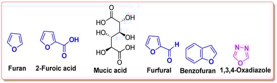 Structures of furan, mucic acid, 1,3,4-oxadiazole and furan-related compounds.
