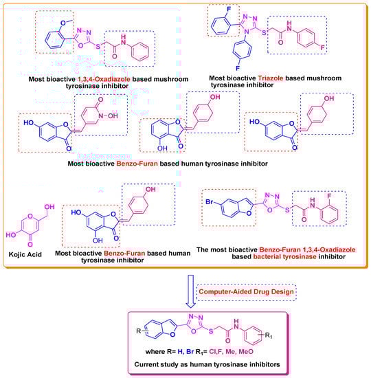 Furan, benzofuran and other nitrogen-oxygen heterocyclic structural motifs had demonstrated excellent medicinal and pharmacological profiles, and exhibited a wide spectrum of biological activities such as antibacterial, anti-fungal, anti-diabetic, anti-acetylcholine, anti-viral, anti-inflammatory, anti-parasitic, fluorescent sensor for analgesic, anti-HepG-2, anti-oxidative, bone anabolic agent and as bacterial tyrosinase inhibitors; they are also part of many natural and synthetic clinical drugs. In various research models, furan scaffolds have shown potent anti-tyrosinase actions which imply that these compounds are effective inhibitors of the melanin biosynthesis in the melanocytes and can be used in treating skin melanomas and other melanogenesis-related disorders, as depicted in Figure 2 [26,27,28,29,30,31,32,33,34,35,36,37,38].