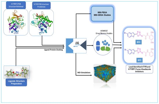 Our previous work reported the evaluation of benzofuran-1,3,4-oxadiazole tethered N-phenylacetamides as bacterial tyrosinase inhibitors and showed strong repressive activities of benzofuran compounds, which encouraged us to apply computer-aided drug discovery (CADD) approaches to assess the therapeutic potential of sixteen synthesized furan-1,3,4-oxadiazole tethered N-phenylacetamide structural hybrids, BF1–BF16 [38,39], with different substituents to target the crucial enzymes hTYR and hTYRP1 of the melanin biosynthetic pathway.