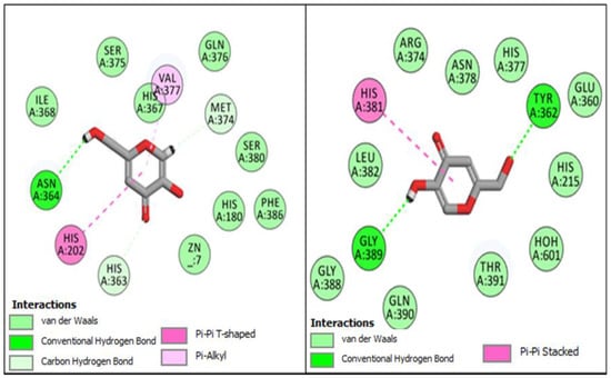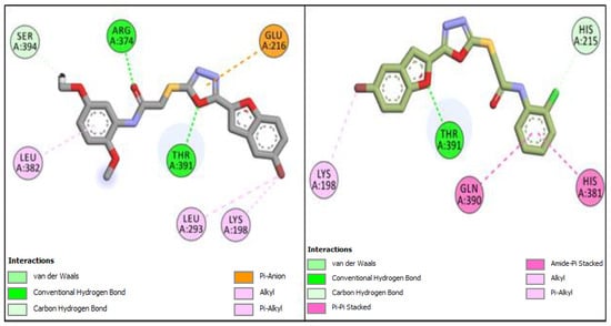 The furan-1,3,4-oxadiazole BF7 compound with a binding affinity of −11.29 Kcal/mol with the hTYRP1 also exhibited several different types of interactions with the LYS198, HIS215, HIS381, GLN390, and THR391 active sites. Figure 8 shows the two-dimensional poses of BF4 and BF7 with the hTYRP1 enzyme.