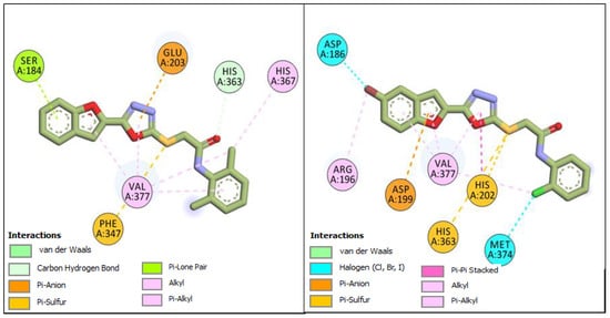 In comparison with the kojic acid inhibitor, some of the synthesized benzofuran compounds showed robust interactions and higher binding affinities with the hTYR and hTYRP1 enzymes of the melanin synthesis pathway. Out of the sixteen compounds, BF1–BF16, three compounds, BF5, BF7, and BF15, showed stronger affinities against the hTYR, while the other three, BF4, BF5, and BF7, showed stronger affinities against the hTYRP1 compared to the standard drug kojic acid. Analysis of the conformational pose and binding affinity of BF5 showed that it binds to the hTYR active site with a binding affinity score of −13.30 Kcal/mol and forms multiple molecular interactions with the hTYR enzyme receptor residues. Hydrogen bonds of conventional and carbon–hydrogen types were noted between the benzofuran ring of BF5 and HIS202, HIS367, GLN376, MET374 residues. Moreover, other interactions, such as Pi–Anion, Alkyl, and Pi–Alkyl interactions (with the VAL377), were also present between the 1,3,4-oxadiazole and benzofuran rings of this compound; in addition, several of the hTyrosinase receptor residues (ASP186 and ARG196) also made halogen molecular interactions with the bromine present on the benzofuran ring of this compound. These are diagrammatically presented in Figure 5.