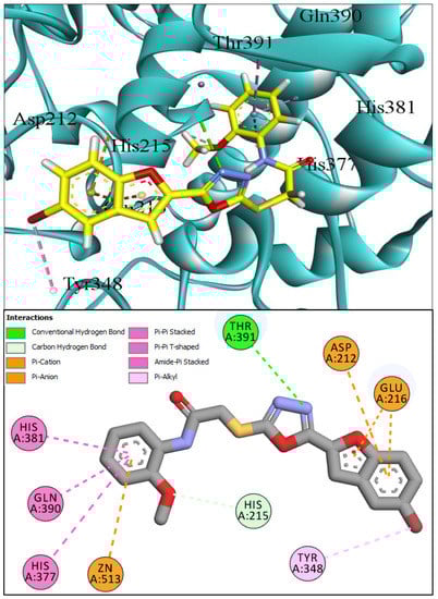 The molecular docking investigations against the hTYRP1 enzyme also revealed that these newly synthesized compounds show superior binding and interactions with this important enzyme. The standard inhibitor kojic acid, as discussed in the previous paragraphs, binds to the hTYRP1 with a binding affinity score of –8.90 Kcal/mol; compared to kojic acid, some of these new furan-1,3,4-oxadiazoles (BF4, BF5, and BF7) have shown good binding affinities towards the hTYRP1 enzyme. The furan-1,3,4-oxadiazoles BF4, BF5 and BF7 were able to bind to the hTYRP1 with binding affinities of −11.50 Kcal/mol, −11.55 Kcal/mol, and −11.29 Kcal/mol, respectively. The conformational pose analysis of BF4 in the active site of the hTYRP1 enzyme showed that it binds with the active pocket residues via different types of molecular interactions. The acetamide group, as well as the oxygen atom of the 1,3,4-oxadizole ring present in this compound, made conventional hydrogen bonds with the ARG374 and THR391 amino acids of the hTYRP1, and a carbon–hydrogen-type H-bond between the –OCH3 and the SER394 amino acid was also present in this ligand–protein complex. The 1,3,4-oxadiazole ring of BF4 also made another Pi–anion interaction with the GLU216 of the hTYRP1 active site, while the bromine atom on the benzofuran ring and the phenyl ring of BF-4 made Alkyl and Pi–Alkyl interactions with LEU293 and LYS198 residues of hTYRP1. BF5, which showed the highest binding affinity (−11.55 Kcal/mol) towards the hTYRP1 active site, also showed robust interactions of different types with this target enzyme. The phenyl ring of BF-5 made a total of four interactions with the HIS381, GLN390, and HIS377 of Pi–Pi stacked, Pi-Pi T-shaped and amide–Pi stacked type along with a direct interaction with the zinc ion present in the active site of the hTYRP1. The 1,3,4-oxadiazole ring engaged the THR391 residue while the benzofuran ring made three Pi–anion interactions with the ASP212 and GLU216; however, the –OCH3 present on the phenyl ring made a single carbon–hydrogen-type H-bond with the HIS215 of the hTYRP1 enzyme active site. Figure 7 shows the three and two-dimensional conformations of BF5 inside the hTYRP1 active site.