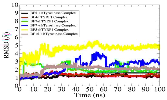 All atoms’ molecular dynamic simulations were conducted for complexes in order to understand and interpret intermolecular dynamics and the stability of docked molecules with the receptor enzymes. As a bio-molecule function in dynamics inside the cells, it is important to evaluate the dynamic behavior rather than focusing on static nature. The trajectories of simulations were generated using the root mean square deviation (RMSD) statistical parameter. RMSD measure the all-atom carbon alpha mean deviation with respect to initial reference position versus time. Higher RMSD describes more structure deviations, while lower RMSD points to small structure changes. The RMSD plot for each complex is provided in Figure 9. The BF4-hTYRP1 (mean RMSD of 0.98 Å), BF15 + hTYR (mean RMSD of 1.62 Å), BF5 + hTYR (mean RMSD of 0.88 Å) and BF7 + hTYRP1 (mean RMSD of 1.86 Å) were the most stable complexes that showed little structure deviations in the simulated time. The mean RMSD of these complexes was 1.2 Å. This stable nature of complexes enables the receptors’ 3D structure to remain confined and fixed in the presence of compounds during simulation time. The BF5 + hTYRP1, on the other hand, reported the highest RMSD, which touches almost five angstroms. It is very clear in the analysis that all complexes, after initial small deviation, attained considerable structure stability. The data showed that the compounds are stably docked inside the active pocket of enzymes, and the binding conformation, except for a few initial small adaptations, remained stable throughout the length of simulation time.