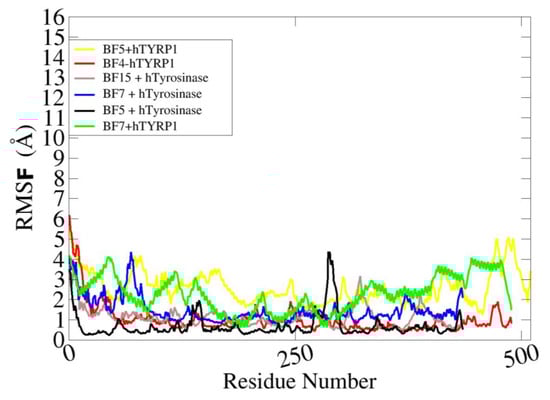 To obtain a further understanding of the residue level flexibility, root mean square fluctuation (RMSF) analysis was conducted. The mean RMSF of BF5 + hTyrosinase, BF7 + hTyrosinase, BF15 + hTyrosinase, BF4-hTYRP1, BF5 + hTYRP1, and BF7 + hTYRP1 is 1.1 Å, 2.2 Å, 0.8 Å, 1.8 Å,2.7 Å, and 2.9 Å, respectively. All the systems reported stable fluctuations at the residue level with major deviations seen at loops. The RMSF of the complexes is shown in Figure 10.