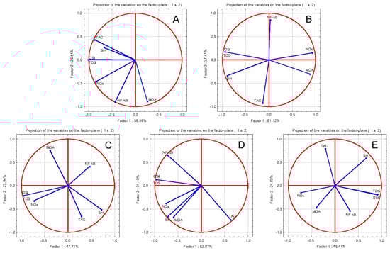 Anti-inflammatory oxidative stress tests PCA results: PCA correlation circles in turpentine oil-induced acute inflammation: (A) INFLAMMATION group: NF-kB increase was positively correlated with oxidants tests, specifically, TOS, OSI, Nox, and MDA (B) DICLOFENAC group: NF-kB reduction was positively correlated only with TOS, OSI, and Nox (C) TOT 100 group: NF-kB reduction was positively correlated only with MDA (D) TOT 50 group: NF-kB reduction was positively correlated only with TOS, OSI, and Nox (E) TOT 25 group: NF-kB reduction was positively correlated only with TOS, OSI, and MDA.
