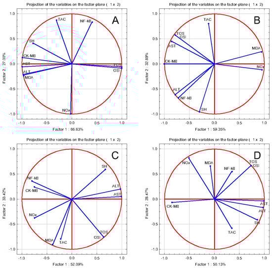 In order to evaluate the relationship between the parameters, a PCA was performed (Figure 2). Original Pearson Correlation information is available in Supplementary Material (Tables S6–S9). In general, in all groups there were correlations between AST, ALT, and CK-MB with the oxidative stress parameters, and also with NF-κB.