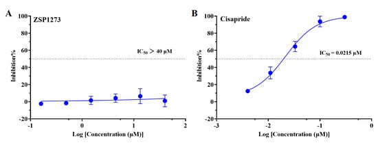 The human ether-a-go-go-related gene (hERG) potassium channel is important in regulating cardiac excitability [20]. To evaluate whether ZSP1273 affects the function of the host’s heart, the inhibitory effect of ZSP1273 on the hERG potassium channel was evaluated. When testing CHO (Chinese Hamster Ovary) cells with stable expression of the hERG potassium channel, the hERG potassium channel current was recorded at room temperature using the whole-cell patch-clamp technique. The IC50 value was calculated based on the % inhibition of the compound on the hERG potassium current. In this assay, the IC50 value of the positive control compound cisapride was 21.5 nM, indicating that the test system was stable and reliable. On the CHO cells with stable expression of the hERG potassium channel, the inhibition percentage of ZSP1273 at 40 µM on the hERG potassium current was less than 50% at 1-min administration. The inhibition percentages of compounds at different concentrations regarding the hERG potassium channel current, along with the corresponding dose–response curves and IC50 values, are shown in Figure 2. These results indicate that ZSP1273 demonstrated no obvious toxicity toward the potassium channel of the host’s heart.