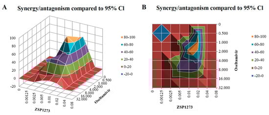 Efficacy of ZSP1273 in combination with oseltamivir in vitro: (A) Positive and negative synergy diagrams of the combined administration. A positive combined index indicates a synergistic effect, while a negative combined index indicates an antagonistic effect. If the absolute value of the index is <25, it indicates an additive effect; if the above value is in the range of 25–50, it indicates a mild but clear synergistic or antagonistic effect; if the above value is in the range of 50–100, it indicates a moderate synergistic or antagonistic effect, which is possibly important for in vivo effects; if the above value is >100, it indicates a high degree of synergistic or antagonistic effect, which is probably important for in vivo effects. (B) An aerial view of (A).