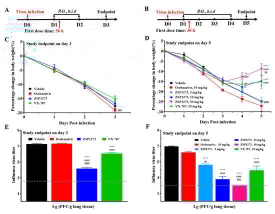The antiviral activity of ZSP1273 in murine infection experiment I (n = 6, mean ± SEM): (A) Flowchart of the experiment (study endpoint on day 3); the day of H1N1 infection is defined as day 0, the first day after infection is denoted as day 1, and so forth. (B) Flowchart of the experiment (study endpoint on day 5). (C) Change in body weight on day 3. (D) Body weight change on day 5. (E) Influenza A virus titers on day 3. (F) Influenza A virus titers on day 5. The viral titer lower than the LOD (2.0 log10) was calculated as 2.0. Note: ** p < 0.01, **** p < 0.0001 (vs. vehicle); # p < 0.05, ## p < 0.01, #### p < 0.0001 (vs. oseltamivir); $$ p < 0.01, $$$ p < 0.001, $$$$ p < 0.0001 (vs. VX−787).