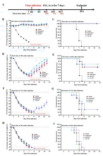 The antiviral activity of ZSP1273 in murine infection experiment II (n = 8, mean ± SEM): (A) Flowchart of the experiments: the day of H1N1 infection is defined as day 0, the first day after infection is denoted as day 1, and so forth. (B,C) Changes in the weight and survival rate, respectively, of mice in each group at 4 h after infection. (D,E) Changes in the weight and survival rate, respectively, of mice in each group at 48 h after infection. (F,G) Changes in the weight and survival rate, respectively, of mice in each group at 72 h after infection. (H,I) Changes in the weight and survival rate, respectively, of mice in each group at 96 h after infection. Based on the weight on the day of infection, a mouse with more than 35% weight loss (indicated by a red dashed line) would be considered dead, according to the IACUC. The survival analysis was performed by the Kaplan-Meier test; * p < 0.05, ** p < 0.01, **** p < 0.0001, compared with the vehicle group.