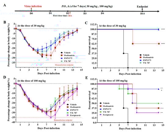 The antiviral activity of ZSP1273 in murine infection experiment III (n = 8, mean ± SEM): (A) Flowchart of the experiments: the day of H1N1 infection is defined as day 0, the first day after infection is denoted as day 1, and so forth. (B,C) Changes in the weight and survival rate, respectively, of mice in each group after infection at the dose of 30 mg/kg. (D,E) Changes in the weight and survival rate, respectively, of mice in each group after infection at the dose of 100 mg/kg. Based on the weight on the day of infection, a mouse with more than 35% weight loss (indicated by the dashed line) would be considered dead, according to the IACUC. Error bars represent the standard error of the mean value. Note: ** p < 0.01, *** p < 0.001, **** p < 0.0001 (vs. vehicle); # p < 0.05 (vs. favipiravir, 100 mg/kg).