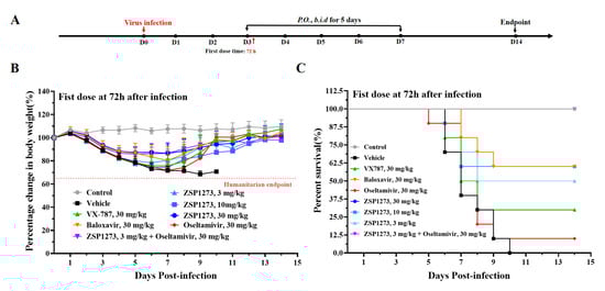 The antiviral activity of ZSP1273 in murine infection experiment IV (n = 10, mean ± SEM): (A) Flowchart of the experiments: the day of H1N1 infection is defined as day 0, the first day after infection is denoted as day 1, and so forth. (B,C) Changes in the weight and survival rate, respectively, of mice in each group after infection. Based on the weight on the day of infection, a mouse with more than 35% weight loss (indicated by the dashed line) would be considered dead, according to the IACUC.