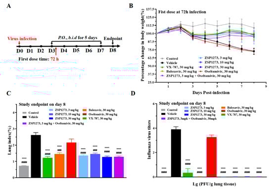 The antiviral activity of ZSP1273 in murine infection experiment V (n = 10, mean ± SEM): (A) Flowchart of the experiments: the day of H1N1 infection is defined as day 0, the first day after infection is denoted as day 1, and so forth. (B) Changes in the weight of mice in each group after infection. (C) Lung index—which is a ratio of the lung weight to body weight—on day 8 in each group. (D) Influenza A viral titers on day 8. Error bars represent the standard error of the mean value. Note: **** p < 0.0001 (vs. vehicle); ### p < 0.001, #### p < 0.0001 (vs. oseltamivir).
