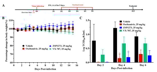 A murine model of LD50 (non-lethal dose) influenza A virus infection was established in order to analyze the effects of ZSP1273 and a combination dosing regimen on influenza A virus replication at 72 h after infection, based on the influenza virus titers in lung tissues. Oseltamivir, VX-787, and baloxavir were used as reference compounds. The flowchart of the experiments is shown in Figure 8A, and changes in the mice’s weight after infection are shown in Figure 8B. After infection with the influenza virus, the mice in the vehicle group lost weight continuously over time. Except for the oseltamivir group, the body weight of the mice in the other administration groups tended to change steadily.