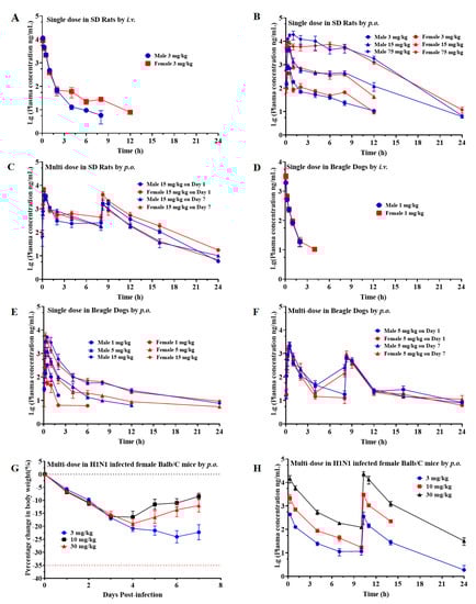 Pharmacokinetic study of ZSP1273 in SD rats, beagle dogs, and mice (n = 3, mean ± SEM): (A) The 24 h concentration–time curves of single-dose ZSP1273 in rats administered i.v. (B) The 24 h concentration-time curves of single-dose ZSP1273 in rats administered p.o. (C) The 24 h concentration-time curves of multi-dose ZSP1273 in rats administered p.o. (D) The 24 h concentration-time curves of single-dose ZSP1273 in rats administered i.v. (E) The 24 h concentration-time curves of single-dose ZSP1273 in beagle dogs administered p.o. (F) The 24 h concentration-time curves of multi-dose ZSP1273 in beagle dogs administered p.o. (G) Changes in the weight of H1N1-infected female BALB/c mice over 7 days. (H) The 24 h concentration-time curves of continuous multi-dose ZSP1273 (3, 10, and 30 mg/kg, twice daily, for 7 days) in H1N1-infected female BALB/c mice administered p.o. Error bars represent the standard error of the mean value.