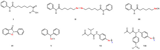 Many analogous hydroxamic acids have been reported. For example, sulfur-based hydroxamic acids have been investigated, and their applications have been documented [20,21,22,23,24]. Surprisingly, there is less focus on hydroxamic acid-based selenium (Se) compounds and their hydroxamic acid derivatives. In fact, and to our knowledge, the only examples related to hydroxamic acid-based Se in the literature are the modified HA (I) compounds to SeHA (II) and SeHA (III) [25,26]; these studies have developed and evaluated anticancer activity, and these compounds were found to be more potent than HA (I) [25,26].