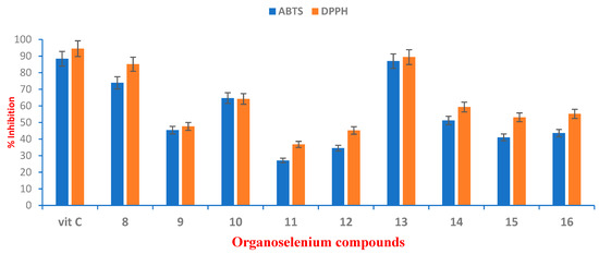 The antioxidant activities of the OSe compounds were intensively investigated because these are usually the cause of their chemopreventive potency [34,39]. Their redox activities were evaluated via DPPH and ABTS assays, using ascorbic acid as the standard [40,41]. We spectrophotometrically measured the antioxidant efficiency of the OSe compounds by their ability to decolorise the DPPH. and ABTS. radicals at 734 and 517 nm, respectively (Figure 2).