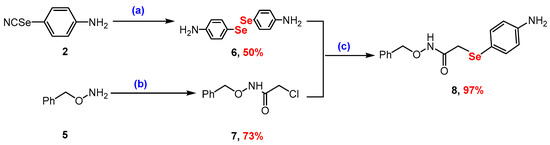 Synthesis of hydroxamic acid 8. Reagents and conditions: (a) 4-selenocyanatoaniline 2 (2.5 mmol, 500 mg), NaOH (2.5 mmol, 100 mg), EtOH (5 mL); (b) o-benzyl hydroxylamine. HCl (9.39 mmol, 1.5 g), DCM (35 mL), Et3N (11.27 mmol, 1.75 mL); chloroacetyl chloride (10.34 mmol, 0.822 mL); (c) 4-N-(benzyloxy)-2-chloroacetamide (2 mmol, 398 mg), 4,4′-diselanediyldianiline (1 mmol, 342 mg) NaBH4 (6.60 mmol, 250 mg).