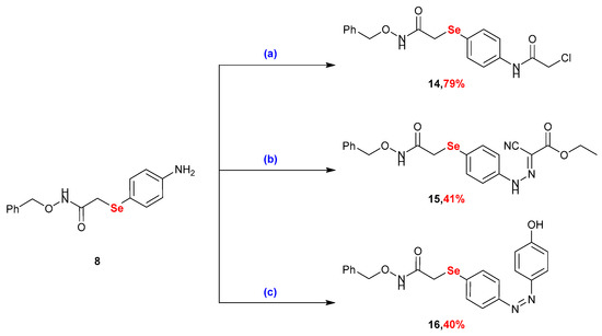 Synthesis of compounds 14, 15, and 16. Reagents and conditions: (a) 2-((4-aminophenyl)selanyl)-N-(benzyloxy)acetamide (8) (2 mmol, 670.54 mg ), potassium carbonate (36.17 mmol, 5 g), acetone (30 mL), chloroacetyl chloride (5 mmol, 397.67 µL); (b) 2-((4-aminophenyl)selanyl)-N-(benzyloxy)acetamide (8) (1 mmol, 335.27 mg), H2SO4 (1.5 mL), sodium nitrite (1.2 mmol, 82.79 mg), ethyl cyanoacetate (1.2 mmol, 135.74 mg), and sodium acetate (1 g); (c) 2-((4-aminophenyl)selanyl)-N-(benzyloxy)acetamide (8) (1 mmol, 335.27 mg), HCl (1.5 mL), sodium nitrite (2.2 mmol, 164.5 mg), phenol (1.2 mmol, 112.93 mg) and sodium hydroxide 10%, 5 mL.