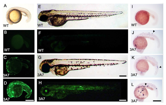 EGFP and CYP3A7 expression in hCYP3A7/EGFP-expressing zebrafish. A pT2A plasmid containing hCYP3A7/EGFP (3A7: C,D,G,H,J–L) was injected together with transposase cmRNA into 1-cell stage embryos. (A–D): 17 hpf, (E–H): 50 hpf. EGFP fluorescence in wild-type (WT) zebrafish (B,F) and that in hCYP3A7-expressing zebrafish (hCYP3A7 zebrafish, 3A7) (C,D,H) are shown. Image (A) is a bright field image of a wild-type embryo. Images (E,G) are bright field images of (F,H), respectively. CYP3A7 mRNA expression was observed at 23 hpf by WISH (I–L). Arrowheads indicate examples of positive signals in J–L. Scale bars = 200 µm.