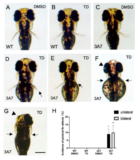 Effects of thalidomide on pectoral fin development of hCYP3A7-expressing zebrafish. Embryos/larvae of wild-type (WT) zebrafish (A,B) and hCYP3A7-expressing zebrafish (3A7) (C–G) were exposed to 200 μM thalidomide (TD) or 0.02% DMSO as a vehicle from 17 hpf to 72 hpf. Arrows in (D–G) indicate pectoral fin malformation. The white arrowhead in (F) indicates bleeding in the dorsal head region. Black arrowheads show a smaller eye (F) and loss of an eye (G). Scale bar = 200 µm. A summarized graph is presented in H (n = 6, 8–26 zebrafish for each case). * p < 0.05, ** p < 0.01.