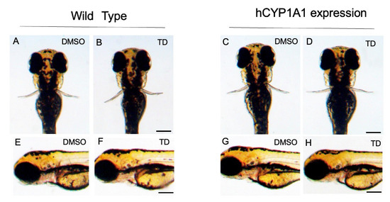 Effects of thalidomide on hCYP1A1-expressing zebrafish during development. Embryos/larvae of wild-type (WT) zebrafish and hCYP1A1-expressing zebrafish (hCYP1A1-zebrafish) were exposed to 200 μM thalidomide (TD) or 0.02% DMSO as a vehicle from 17 hpf to 72 hpf. (A,B, E,F): wild-type zebrafish. (C,D,G,H): hCYP1A1-zebrafish. Zebrafish in (A,E,C,G) were exposed to DMSO. Zebrafish in (B,F,D,H) were exposed to thalidomide. (A–D): dorsal views; (E–H): lateral views. Scale bars = 200 µm.