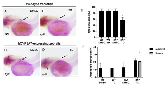 Thalidomide-induced reduction in fgf8 expression in pectoral fin buds of hCYP3A7-expressing zebrafish. Wild-type (WT) (A,B) and hCYP3A7-expressing embryos/larvae (CYP3A7) (C,D) were exposed to 200 µM thalidomide (TD) or 0.02% DMSO (DMSO) as a vehicle from 17 hpf until 48 hpf. Larvae were fixed at 48 hpf for whole-mount in situ hybridization with an fgf8 probe. Summarized data are presented as graphs in (E,F) (n = 3, 7–10 embryos for each case). (E,F) indicate percentages of fgf8 expression and percentages of unilateral and bilateral loss of fgf8 expression in the presence or absence of thalidomide. * p < 0.05. Scale bar =100 µm.