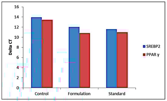 This study showed that fold expression for SREBP-2 was higher for standard simvastatin (5.02) than formulation F40 and transcription factor PPAR-γ fold expression (6.06) was greater for formulation F40 than for standard simvastatin as shown in Figure 1, indicating an increased lipid metabolism through this pathway due to the presence of chitosan. This also indicates that both simvastatin and chitosan follow different metabolic pathways, which could avoid possible toxicity. Simvastatin also expresses PPAR-γ due to the anti-inflammatory effect exerted by it and indirectly induces the activity of PPAR-γ.
