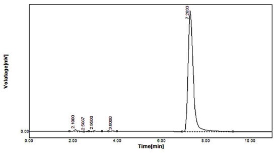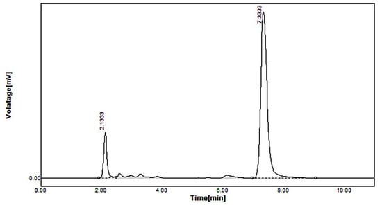 HPTLC revealed that cholesterol excretion in feces increased from 1.71 ± 0.28 to 2.89 ± 0.19 mg/day/animal in the formulation F40-treated group compared to other groups. These results were compared using HPLC peaks. The bile acid chenodeoxycholic acid increased from 0.19 ± 0.001 to 4.02 ± 0.21 mg/day/animal of fecal matter in the formulation F40 group compared to the control group as shown in Figure 2, Figure 3 and Figure 4. The lithocholic acid (a secondary metabolite of chenodeoxycholic acid) and the ratio of secondary to primary metabolite decreased from 5.89 ± 0.84 to 3.78 ± 0.61 mg/day/animal and from 4.67 ± 0.42 to 2.42 ± 0.18, respectively, in the formulation F40 group. The major metabolic products of cholesterol, viz. corprostanol and cholestanol, were not significantly increased and peaks were not seen in the densitogram for groups IV as shown in Figure 4. This indicates that chitosan in formulation F40 reduced the conversion of cholesterol and primary bile acids.