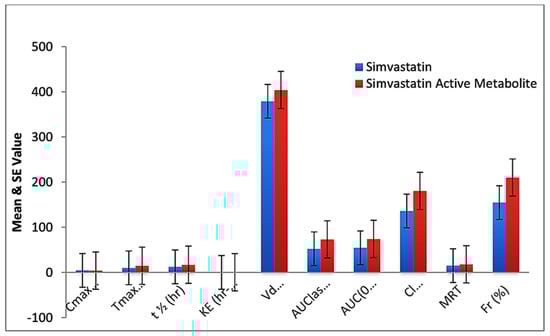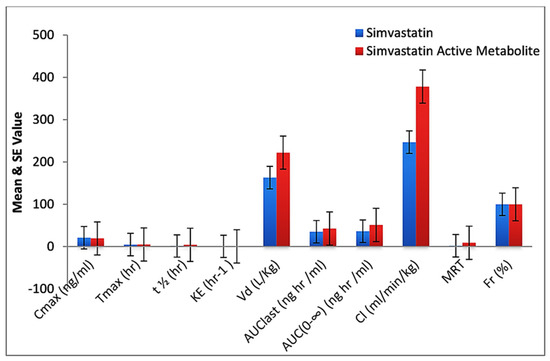 Lower plasma levels of simvastatin and simvastatin acid were observed with formulation F40 than with standard drug after oral administration. The AUC of formulation F40 (53.17 ng/mL, 73.11 ng/mL) and the Tmax F40 (10 h, 14.56 h) were significantly higher than for standard simvastatin (36.38 ng/mL, 51.11 ng/mL and 4.72 h, 5 h). The Cmax was lower for formulation F40 (4.33 ng/mL, 3.98 ng/mL) than for standard simvastatin (21.12 ng/mL, 19.42 ng/mL). The higher Tmax, AUC, and a lower Cmax indicate the sustained-release properties of formulation F40. Generally, the drug molecules are absorbed rapidly from GIT due to an improved dissolution rate by a reduced particle size, an increased surface area, and diffusional layer thickness (nanoparticle formation and intermolecular hydrogen bonding). The mucoadhesion and controlled delivery of the drug from formulation F40 were responsible for sustained release, leading to a low Cmax but a prolonged Tmax and AUC. Half-life and MRT were also higher for nanoformulation F40 than for standard drug (Figure 7). A higher Vd (378.90 ± 112.3 ng/mL, 404.00 ± 134.98 ng/mL) and KE and a lower Cl (135.78 ng/mL, 180.34 ng/mL) for nanoformulation F40 (Figure 8) than for standard simvastatin also confirmed the sustained-release property and lower plasma protein binding. In the case of standard simvastatin, a lower Cmax and Cl, and a higher Tmax, AUC, Vd, t1/2, KE, and MRT were observed, showing a steady-state concentration. p values were found to be significant for the Cmax, Tmax, t1/2, KE, Vd, AUC last AUC(0–∞), Cl, and MRT at p < 0.05. Relative bioavailability or bioequivalence is the most common measure for comparing the bioavailability of one formulation of the same drug to another. The mean responses such as the Cmax and the AUC were considered to determine relative bioavailability.