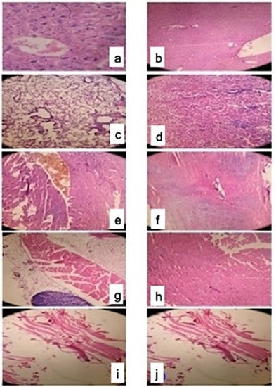 Histopathological evaluation of vital organs and muscles of group I mice (n = 3). (a—liver, b—brain, c—lung, d—kidney, e—heart, f—vastus medialis, g—biceps brachii, h—biceps femoris, i—soleus, and j—tibialis cranialis.).