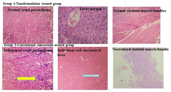 In the control/HFD group of mice, the incidence of fiber necrosis was not observed (Figure 9. In the standard simvastatin-treated (group 3), all aspects of induced muscle necrosis were remarkably similar in all three mice. Most of the organs and muscles sampled from the hind limb except the soleus were affected by necrosis. Muscle necrosis was segmental, affected individual fibers, and characterized by loss of cytoplasmic structure, vacuolation, and little or no inflammatory infiltrate. In the nanoformulation F40-treated (group 4), muscle necrosis or negligible necrosis was not detected (Figure 10).