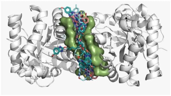 Additionally, a blind molecular docking was performed to assess the potential binding of each control compound at the site predicted by the DoGSiteScorer tool (assigning a docking score) []. In this study, blind molecular docking showed docking scores of −9.2 to −7.1 Kcal/mol of the control compounds at the LmTIM dimer interface (Table 1). Compound C6 had the lowest docking score of −9.2 Kcal/mol. The other five control compounds showed docking scores from −7.8 to −7.1 Kcal/mol (Figure 1). The interface, contrary to the active site, is a non-conserved site. It has been studied because it causes a selective allosteric enzymatic inhibition in protozoa by promoting the destabilization of the protein’s quaternary structure, leading to death [,].
