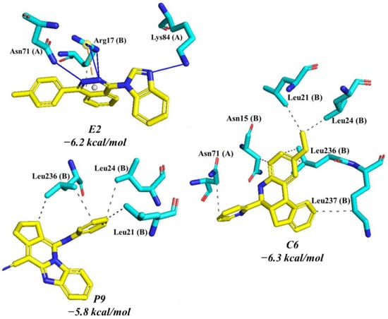 Interaction profile and docking score of compounds C6, E2 and P9 at the HsTIM interface. Hydrogen bonds are shown as blue lines, hydrophobic interaction as gray dashed lines, and salt bridge interactions as yellow dashed lines. Interactions were obtained using the PLIP online server.