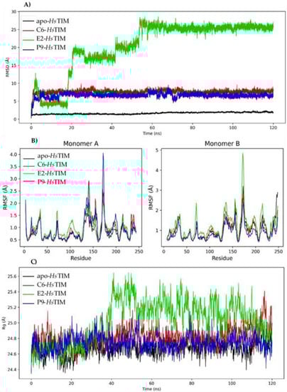 In addition, the Rg (Figure 4C) was determined for the apo-HsTIM with values from 24.29 to 25.17 Å, with a mean oscillation of 24.68 Å. For the C6-HsTIM and P9-HsTIM complex, the Rg was very similar (24.35 and 24.36 Å) with a mean oscillation of 24.81 and 24.74 Å, respectively. E2-HsTIM complex presented a minimum fluctuation of 24.32 Å and a maximum of 25.73 Å with a mean oscillation of 24.74 Å.