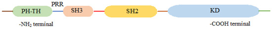 BTK’s structural domain is composed of five different protein interaction sites: an N-terminal (-NH2 terminal) pleckstrin homology (PH) and TEC homology domain (TH), a proline-rich region (PRR), two SRC homology domains (SH3 followed by SH2), and a C-terminal (-COOH terminal) kinase domain (KD) with enzymatic activity [9]. These domains bind to different cytosolic proteins and transcriptional factors to mediate the cell signaling pathways. PH-TH and PRR domains contain a zinc-finger motif that is important for the optimal activity and stability of the protein [10]. BTK presents an inactive conformation in the cytoplasm in which the SH2 and SH3 domains stabilize the inactive conformation of the kinase and are only transiently recruited to the membrane upon activation [11].