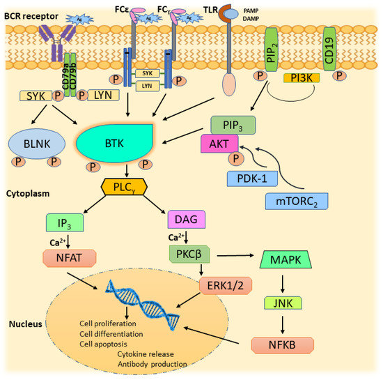 BCR signaling also activates BTK in cells like mast cells, basophils, monocytes, macrophages, and osteoblasts involved in hematogenesis and autoimmunity [7]. FCγ and FCε receptors in macrophages and mast cells are modulated by BTK signaling, shown in Figure 3. Antigen binding to these receptors activates LYN and SYK, which activates BTK, resulting in the activation of the MAPK pathway and leading to the release of inflammatory cytokines [50]. Toll-like receptors (TLR), on recognizing disease-specific, damage, and pathogen-associated structural patterns (DAMP and PAMP), activate host immunity. BTK is essential for the TLR-mediated release of inflammatory cytokines [51]. Thus, the depletion of BTK activity shall be helpful in the prognosis of autoimmune diseases.