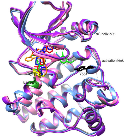 We focused on recent BTK-Ncovi optimized for better potency, selectivity, and metabolic stability than the current clinical candidates. Therefore, the inhibitor effect on BTK mutations was not considered. Development in non-covalent inhibitors’ chemistry and BTK binding was ascertained from PDB structures deposited recently. PDB IDs 7KXQ, 6W07, 7LTZ, 6XE4, and 6X3P were investigated for the structural complementarity between BTK-NCovis [84,85,86,87,88]. Overlay of the fenebrutinib-bound BTK-kinase domain on BTKbound to the recent non-covalent inhibitors in Figure 9, shows that the currently developed BTK-Ncovi occupy and interact with the kinase domain of BTK. The catalytic site engagement is also similar to that of fenebrutinib. All novel BTK-NCovi filled the kinase domain’s H3, H2 clefts, and the H1 hinge area. Their primary interaction was with Tyr551 in the activation kink, altering its conformation. Almost all BTK-Ncovi interact with BTK’s inactive autoinhibited conformation stabilizing the αC-helix-out conformation, resulting in extended docking of ligands leading to prolonged inhibition [83,84].