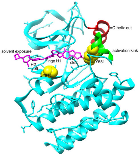 Before analyzing the recent depositions in PDB, it is essential to revise the existing knowledge about non-covalent binding to BTK. Non-covalent binding to BTK can be explained by taking fenebrutinib as an example. BTK-Ncovi binds to the kinase domain, and their interactions are not restricted to Cys481 [82]. A detailed structure-activity relationship investigation on BTK-Ncovi revealed the complementary functional groups for enhanced potency, selectivity, and favorable metabolic and safety profile. In addition, the binding site engagement by fenebrutinib was charted out. Fenebrutinib resulted in an induced fit to the kinase domain producing a conformational change in the activation kink that stabilizes BTK in its inactive conformation, shown in Figure 8. The lipophilic tricyclic ring exhibits shape complementarity to the H3 cleft and interacts with Tyr551 in the activation kink, thus inhibiting the autophosphorylation. Fenebrutinib possesses hydrophobic groups filling the H2 cleft and H1 hinge region in an extended ‘U’ conformation. The terminal oxetane-linked piperazine in fenebrutinib is prone to solvent exposure and engaged H2 cleft. The core pyridone ring engaged the H1 hinge [83].