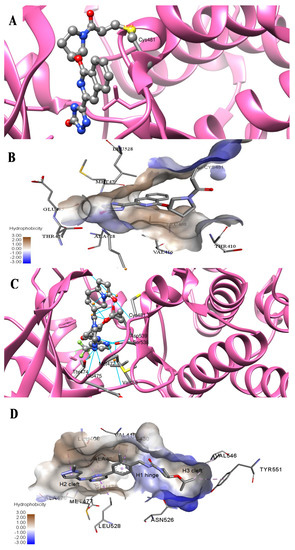 The binding of BTK-Ncovi occurs through an induced-fit mechanism; preliminary interaction with Tyr551 or any adjacent residue like Lys430 in the activation kink induces conformational changes generating H3 cleft specific for BTK [84,90]. For example, Figure 11C,D shows the hydrogen bonding and hydrophobic interactions of the non-covalent inhibitor BIIB068 with BTK. BIIB068 is an orally effective, BTK-selective inhibitor. The side chain isopropyl group attached to the azetidine ring forms complementary ℼ-alkyl interaction with Tyr551, the phosphorylation site in the BTK kinase domain. This hydrophobic interaction alters the conformation of BTK, generating an H3 cleft and placing the azetidine ring deep into the pocket. Furthermore, it favors the angular orientations of the aromatic benzyl reverse amide group into the hinge region and the H2 binder, pyrazolyl pyrimidine, submerged into the H2 cleft. Several other favorable ℼ-sigma and ℼ-alkyl interactions with Leu408, Val416, Ala428, Leu528, and Val546 residues stabilize the active conformation of BIIB068. Unique hydrogen bonds with H1, H2, and H3 residues also stabilize BIIB068 active conformation. Hydrogen bonding happened with the crucial Met477 hinge residue. It is further interesting to note the involvement of water molecules in facilitating the hydrogen bond network with Phe413, Gly414, Lys430, and Arg525 within an interatomic distance of 4 Å. The amide and secondary amine linkers play a significant role in hydrogen bonding, along with pyrimidine nitrogen. Consequently, complementary angular conformational orientation and electrostatic and hydrophobic moieties of non-covalent inhibitors are key features driving non-covalent BTK inhibition.