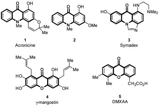 Xanthone and acridone are privileged scaffolds for searching antitumor activity (Figure 1), and they are found in both natural and non-natural anticancer compounds. For example, Acronicine 1, a known naturally occurring anti-tumor agent, was identified as an agent having activity against human colon carcinoma HCT116 [2], human prostate carcinoma DU145 [2], human epidermoid carcinoma KB-3-1 [3], and other cell lines [3,4,5,6,7].
