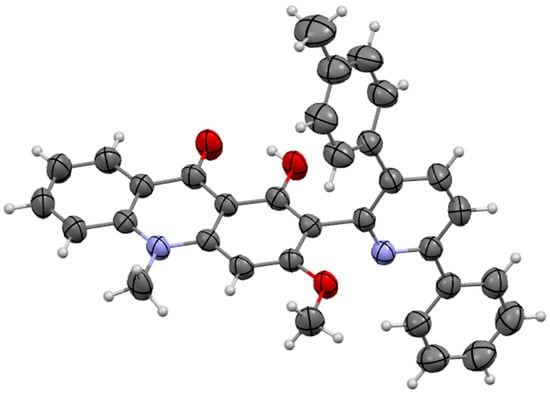 1-Hydroxy-3-methoxy-10-methyl-2-(6-phenyl-3-(p-tolyl)pyridin-2-yl)acridin-9(10H)-one 10b. Yellow powder, m.p. > 250 °C. 83% yield. 1H NMR (400 MHz, DMSO-d6) δ 14.87 (s, 1H), 8.31–8.37 (m, 1H), 8.06–8.11 (m, 2H), 7.93 (d, J = 8.0 Hz, 1H), 7.78–7.84 (m, 3H), 7.43–7.50 (m, 2H), 7.32–7.43 (m, 2H), 7.13–7.19 (m, 2H), 6.99–7.04 (m, 2H), 6.50 (s, 1H), 3.96 (s, 3H), 3.77 (s, 3H), 2.25 (s, 3H). 13C NMR (101 MHz, CDCl3) δ 180.4, 163.3, 162.4, 156.1, 151.5, 144.4, 141.9, 139.8, 137.9, 137.7, 137.0, 136.5, 133.8, 128.6, 128.5, 128.4, 128.3, 127.2, 126.4, 121.5, 120.9, 119.4, 114.7, 110.9, 105.1, 86.2, 67.9, 55.5, 34.1. Anal. Calcd for: C33H26N2O3: C, 79.50; H, 5.26; N, 5.62%. Found: C, 79.45; H, 5.21; N, 5.58%.