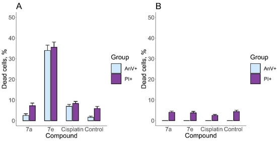 The data obtained confirm the marked effect of 7e against malignant cells (Figure 4), using the A-172 line as an example. In addition, the effect of the studied compounds was compared in the experiment with the widely used anticancer drug cisplatin at a similar concentration (6 µM) to compare the intensity of the cytotoxic effect. Compound 7e showed a more intense effect against tumor cells of the A-172 line than cisplatin. At the same time, there was no significant increase in the number of dead cells in the HEK-293 line (Figure 3 and Figure 5).