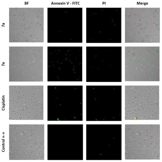 Based on the results of cell staining with a mixture of Annexin V-FITC and PI, the number of A-172 and HEK-293 live, apoptotic, and dead cells was calculated for the compounds that showed the greatest effectiveness in suppressing the viability of malignant cells, 7a and 7e (Figure 3).