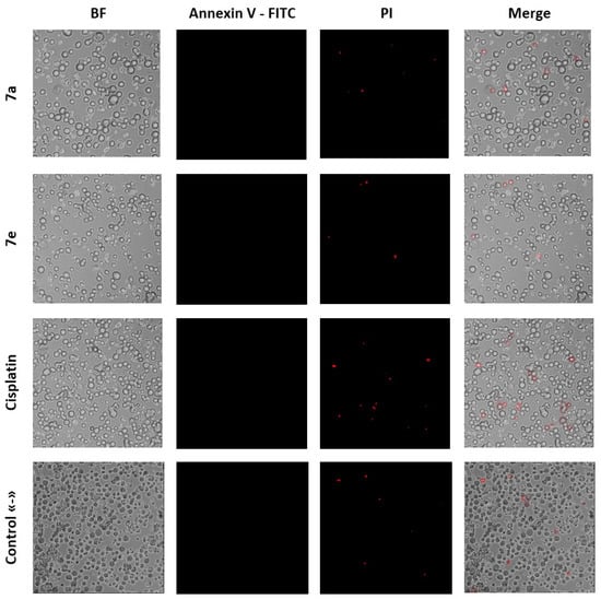 Fluorescence staining of human embryonic HEK-293 kidney cells with Annexin V-FITC and PI dyes under the action of the test compounds 7a and 7e in comparison with cisplatin (concentration of 6 µM) and intact cells. Cells in early apoptosis were stained green (Annexin V-FITC), cells in late apoptosis and necrosis were stained red (PI), 200× magnification.