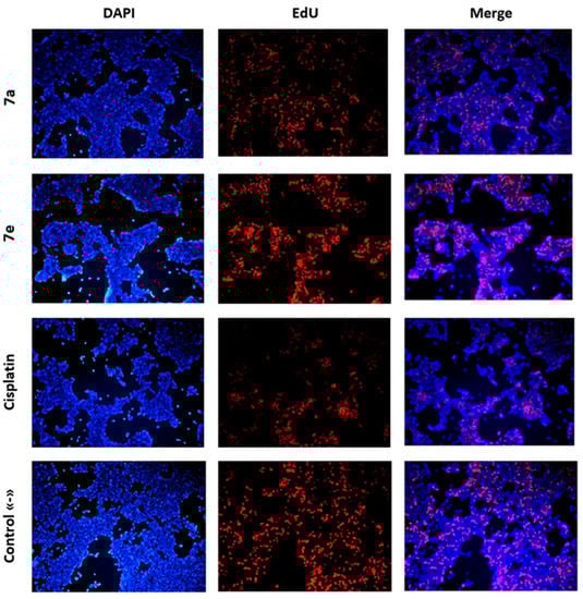 Assessment of DNA synthesis intensity in human embryonic kidney cell cultures of HEK-293 line under the action of compounds 7a and 7e. Blue color stains the nuclei of all cells using DAPI dye, and red nuclei of cells with active DNA synthesis (EdU), at 100× magnification.