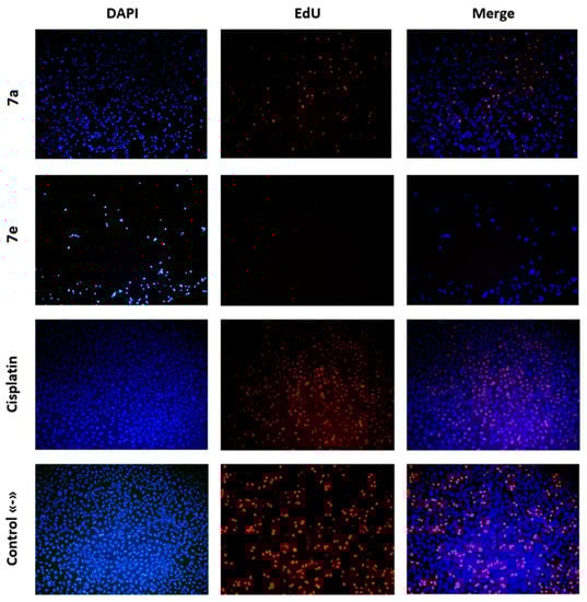Assessing the effect of compounds 7a and 7e under study on the ability of cells to synthesize DNA in the HEK-293 line (Figure 6), a minimal effect comparable to intact cells, which served as a negative control, can be noted. Some decrease in proliferative activity can be noted in cisplatin-treated cells. At the same time, a more pronounced effect of compounds 7a and 7e on DNA synthesis in cells is observed in line A-172 (Figure 7). It should also be noted that no signs of cell proliferation were detected in the experiment with compound 7e. In addition, Figure 4 and Figure 7 show a significant decrease in the total number of cells in the experiment with compound 7e relative to the other groups.