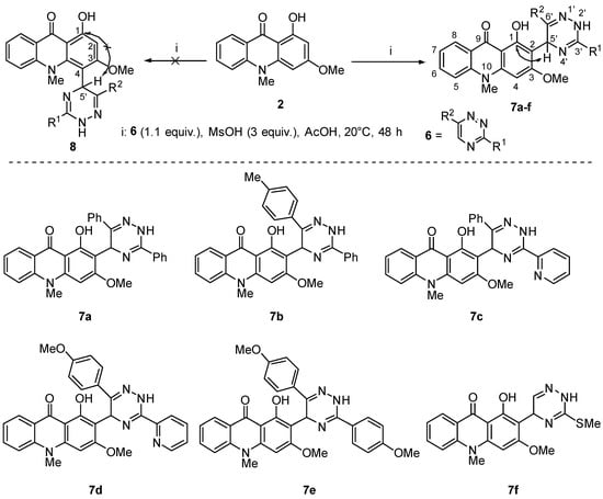 In acetic acid (10 mL), 1-hydroxy-3-methoxy-10-methylacridin-9(10H)-one 2 (257 mg, 1.0 mmol), 1,2,4-triazine 6 (1.1 mmol), and methanesulfonic acid (288 mg, 3.0 mmol) were dissolved and the mixture allowed to stand for 48 h. The mixture was poured in water and quenched with an NaHCO3 solution, and the precipitate was filtered and recrystallized from ethyl acetate yielding pure 7a–7f.