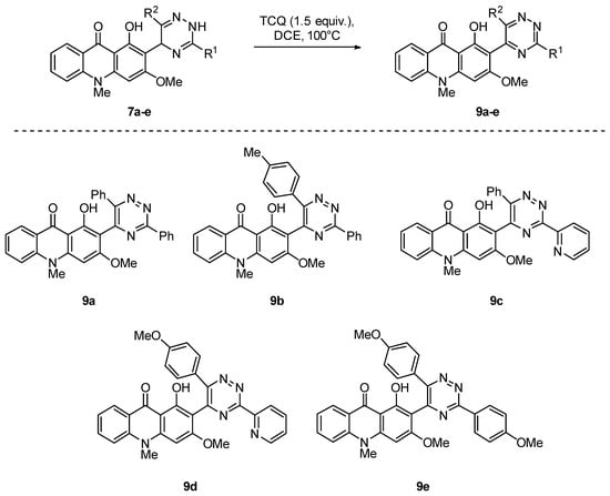 Compounds 7a–e (0.5 mmol) and tetrachloro-p-benzoquinone (183 mg, 0.75 mmol) were dissolved in dichloroethane (7 mL), and the mixture was refluxed for 6 h. Then, dichloroethane was evaporated, and the residue was recrystallized from toluene to obtain 9a–e.