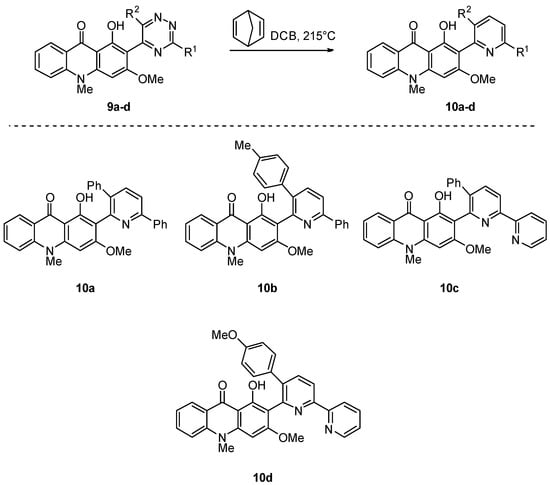 To further evaluate the role of the 1,2,4-triazine ring for anticancer activity, we transformed the 1,2,4-triazine moiety of compounds 9a–d into pyridine compounds 10a–d (Scheme 3). The reaction proceeds as [2+4] cycloaddition followed by nitrogen and cyclopentadiene extrusion (Boger reaction). We used previously described conditions suitable for this transformation [24,25]. The structure of compounds 10 is consistent with their NMR spectral data. The structure of the product 10b was proven using X-ray diffraction analysis (Figure 2).